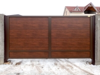 Конструкция премиум-качества. В основе лежит сэндвич-панель толщиной 45 мм. Идеально подходит для эксплуатации в регионах с нестабильным климатом и перепадом температур. Ворота могут выдерживать ураганные порывы ветра – до 120 км/ч. В стандартной комплектации полотно выполнено из нержавеющей стали с защитным слоем ПУР-ПА от выгорания и растрескивания покрытия.